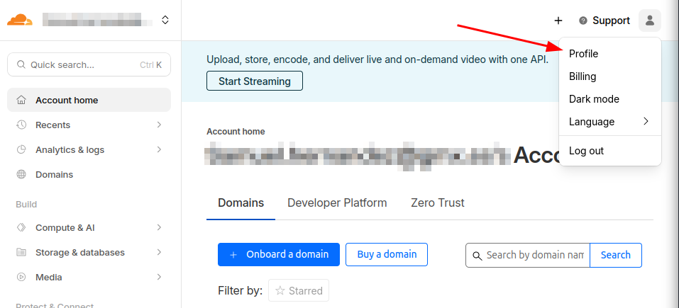 En la sección de Profile vamos a API Tokens y le damos a Create Token. Cloudflare te recomienda usar Account API Tokens en caso de no tener una cuenta de servicio para estas cosas, pero al caso el proceso es el mismo.