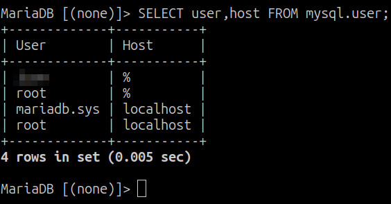 MariaDB [(none)]> SELECT user,host FROM mysql.user;